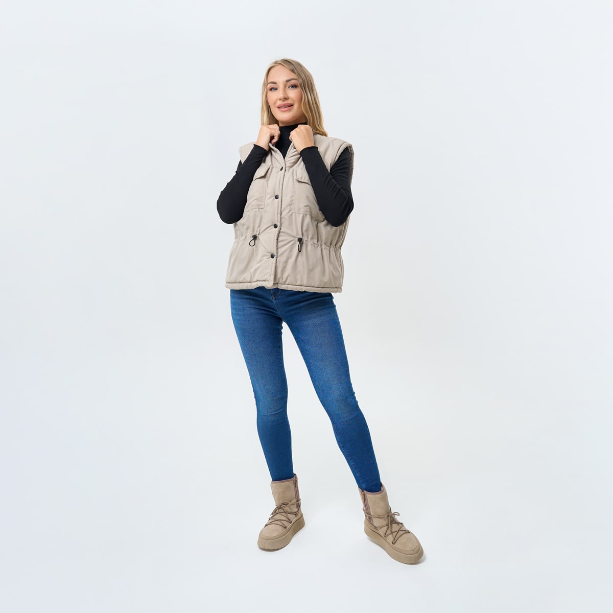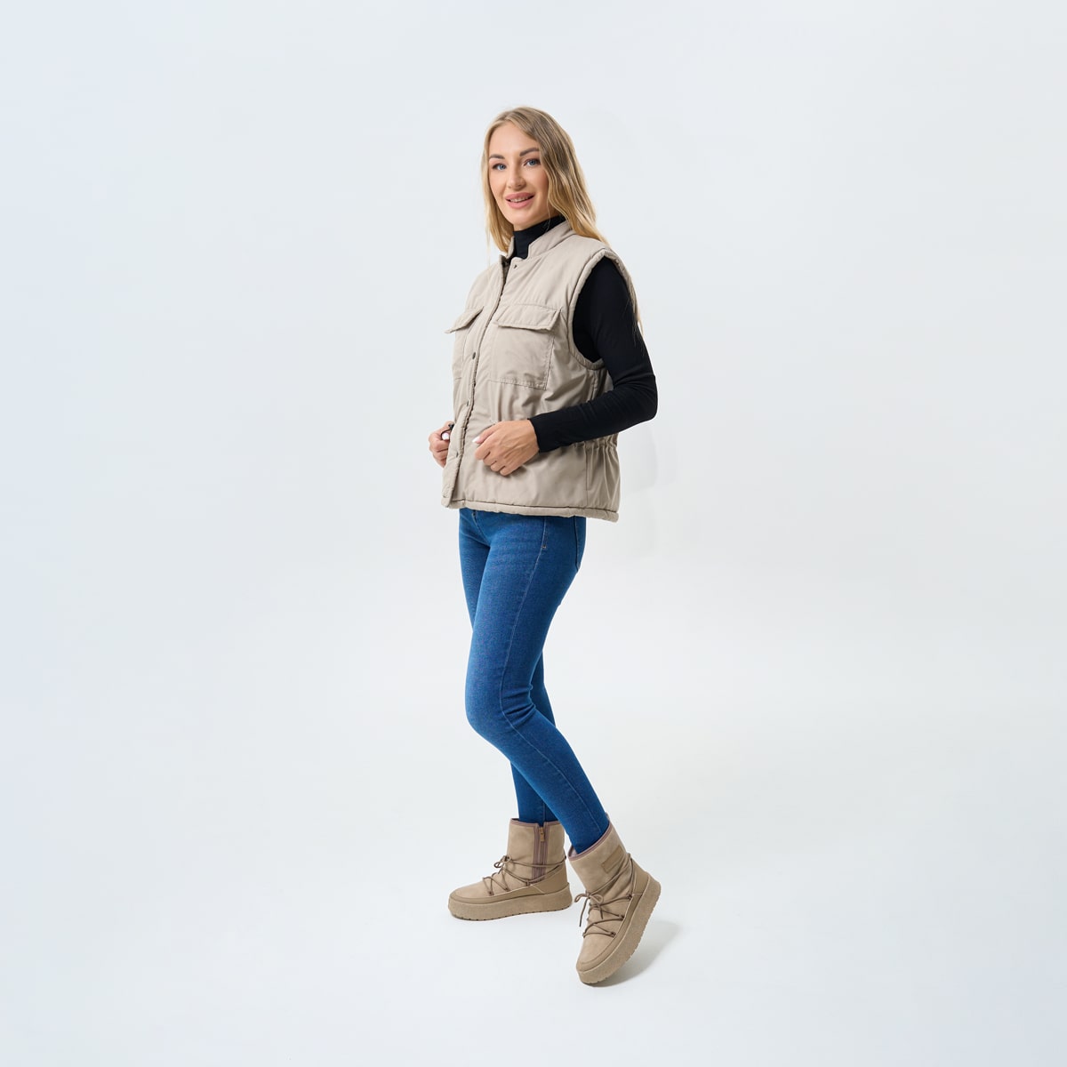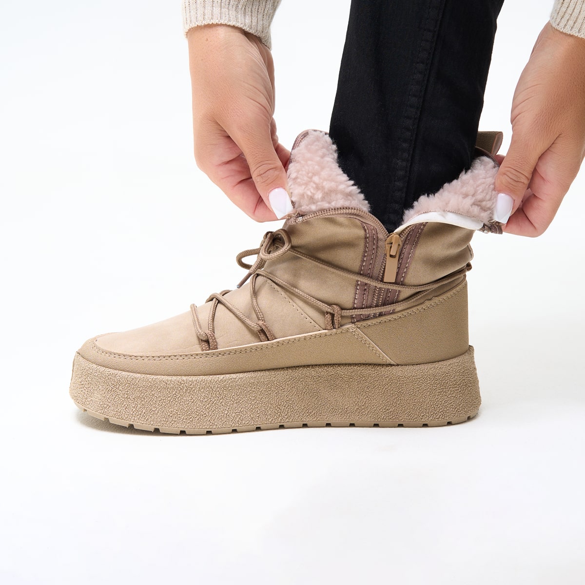 Зимові чобітки у спортивному стилі — це поєднання затишку, комфорту та сучасного дизайну. Виготовлені з високоякісної екошкіри зовні та м’якого утеплювача всередині, ці чобітки стануть ідеальним вибором для прогулянок у холодну пору року. Гнучка підошва зі спіненого матеріалу забезпечує гарне зчеплення з поверхнею, зменшуючи втому ніг, а декоративна шнурівка по зовнішньому контуру надає взуттю стильного міського акценту. Доступні у двох універсальних кольорах — бежевому та чорному — ідеально підходять до будь-якого гардероба.