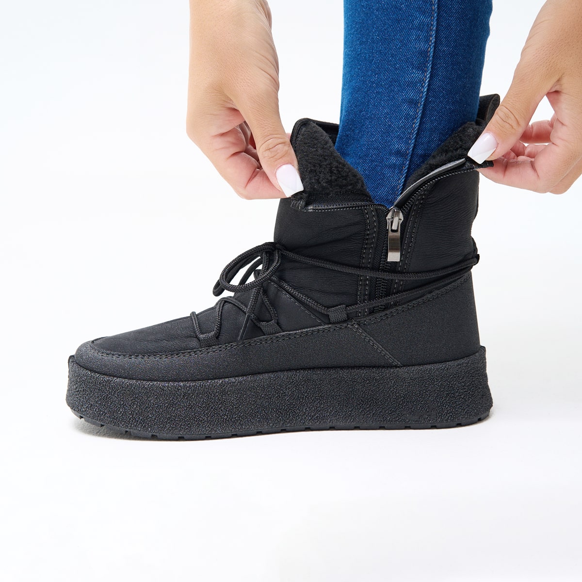Внутрішнє оздоблення з теплого еко-хутра та анатомічна форма устілки забезпечують м’якість і термоізоляцію. Навіть при тривалому носінні ноги залишаються в теплі й без втоми.