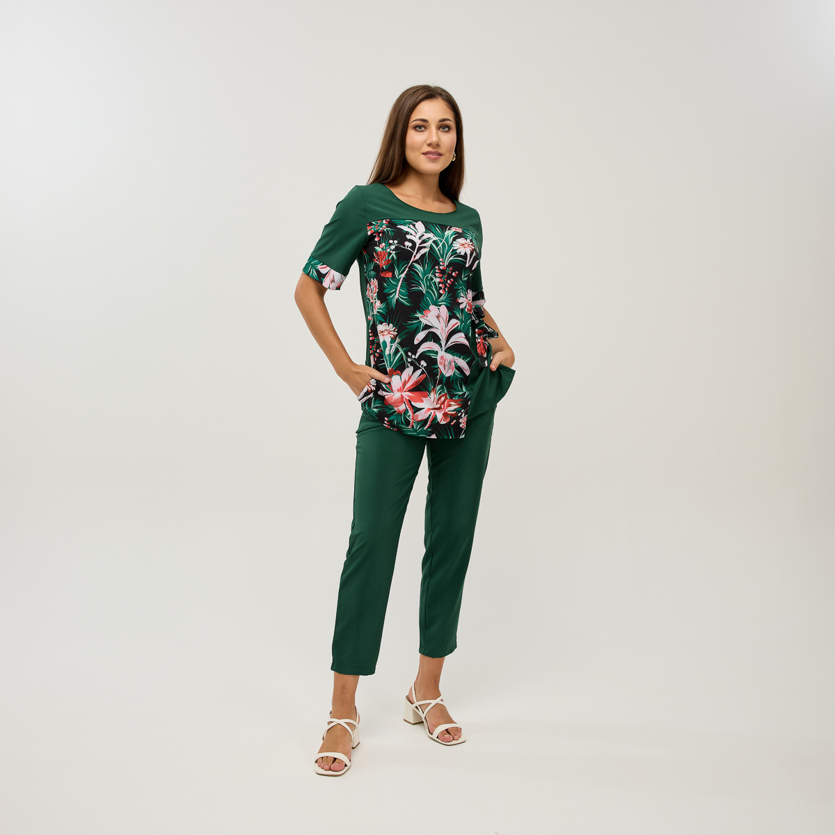 Ребекка - костюм, який миттєво додасть вишуканості вашому образу! Пошитий з неймовірно м'якої та легкої тканини. Унікальний крій блузки підійде для будь-якого типу фігури та підкреслить її жіночу привабливість. Квітковий малюнок додасть свіжості, а скорочені, легко облягаючі брюки з кишенями акцентують увагу на вишуканості ваших ніг.