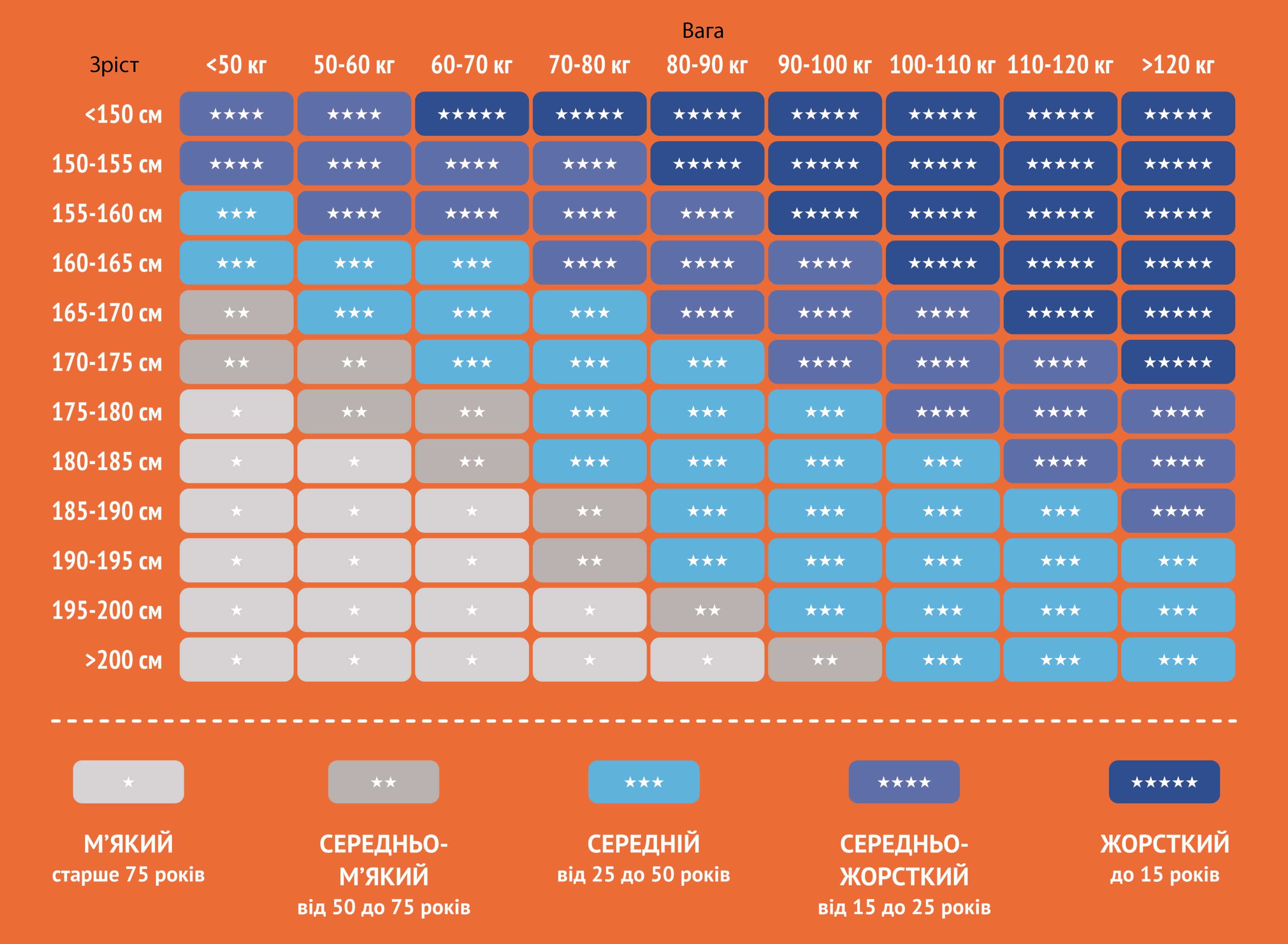 Зробити правильний вибір дозволить вдумливий підхід до покупки. Вага має істотне значення на визначення потрібної жорсткості спальної поверхні.